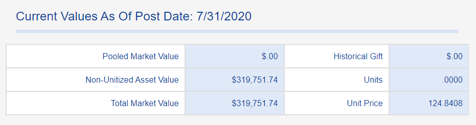 Non-unitized assets add to the TOTAL market value of an endowed pool. To view non-unitized assets, you would need to select a report that displays "total" value as opposed to pool value.