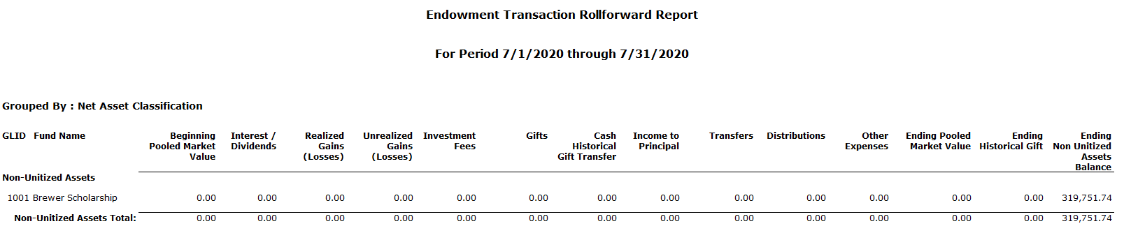 In addition, we have a newer report called the Endowment Transaction Rollfoward Report. It is similar to the Investment Pool Transaction Summary Report, but has an additional column at the end that displays non-unitized assets, shown below. This report can be deployed to databases upon request.
