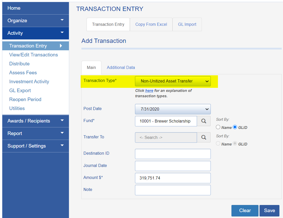 To record the non-unitized asset's initial balance, enter a transaction type of “Non-Unitized Asset Transfer” on the TRANSACTION ENTRY screen under ACTIVITY (show below). The Non-Unitized Asset Transfer transaction type does not impact your cash reconciliation or ending pooled market value.